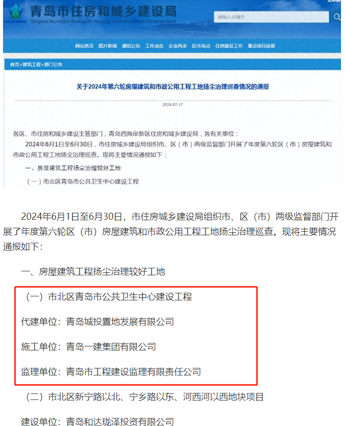 近日,青岛城投集团旗下城市更新集团公共卫生中心项目积极响应市住建局号召,做好项目扬尘治理,并在青岛市住建局2024年第六轮房屋建筑和公用工程工地扬尘治理检查中获通报表扬。