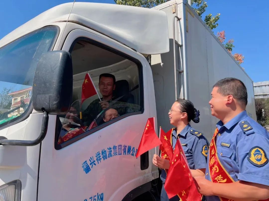 (工作人员与司机进行国庆主题互动)