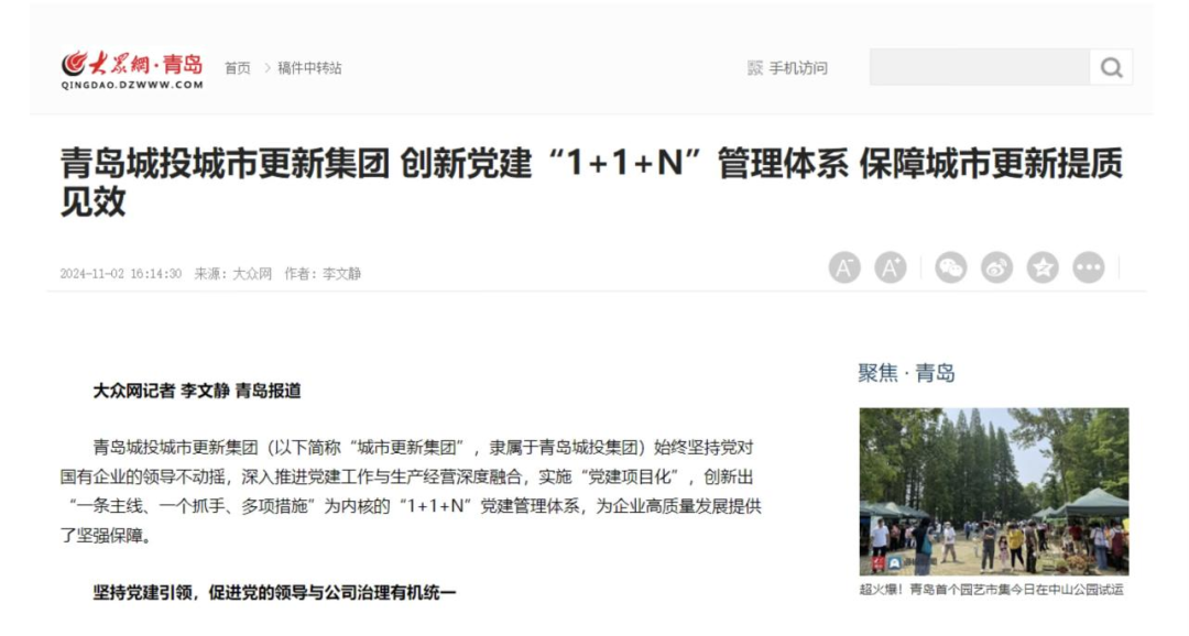 近日,大众网刊发了青岛城投集团旗下城市更新集团《创新党建“1+1+N”管理体系 保障城市更新提质见效》文章,报道城市更新集团创新党建工作,深入推进党建工作与生产经营深度融合方面的优秀成果,以下为报道原文:
