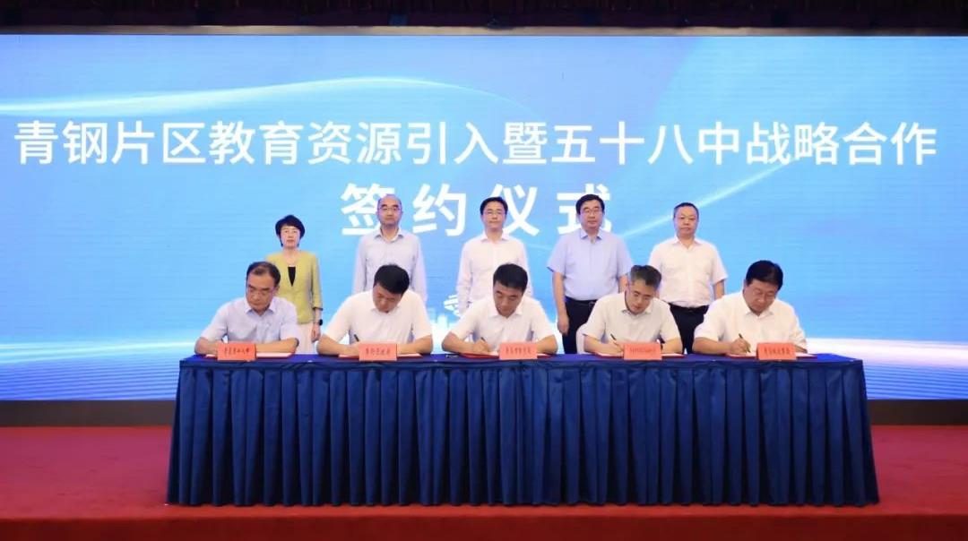 8月8日,青钢片区教育资源引入暨五十八中北校区战略合作签约仪式在市级机关会议中心举行。市政府党组成员、副市长解宏劲出席签约仪式,市教育局、市自然资源和规划局、李沧区等单位相关负责同志参加。青岛城投集团党委书记、董事长李蔚,党委委员、副总经理林松涛参加签约仪式。(图为签约仪式现场)李蔚表示,青钢片区开发项目是我市城市更新和城市建设三年攻坚行动十大重点片区之一,三年攻坚行动启动以来,城投集团在市委市政