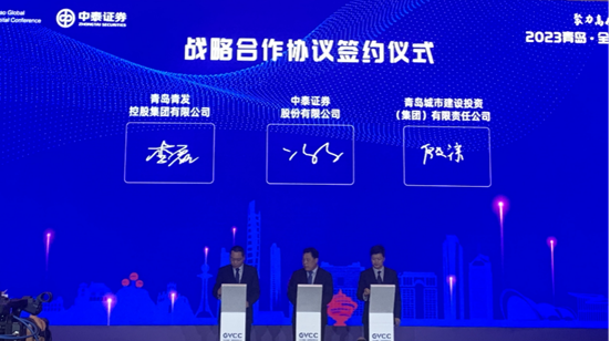 5月12日,由青岛市人民政府主办的2023青岛·全球创投风投大会正式开幕。大会以“创投风投创时代 创新创业创未来——聚力高质量 澎湃新动能”为主题,打造合作共赢的创投风投交流平台,激活高质量发展新动能。青岛城投集团应邀参加本次创投风投大会,并在本次会议论坛上与中泰证券签署战略合作协议。城投集团党委委员、副总经理殷淙,中泰证券总经理冯艺东等出席签约仪式,城金集团、创投公司有关负责同志一同参加活动。(图为签约
