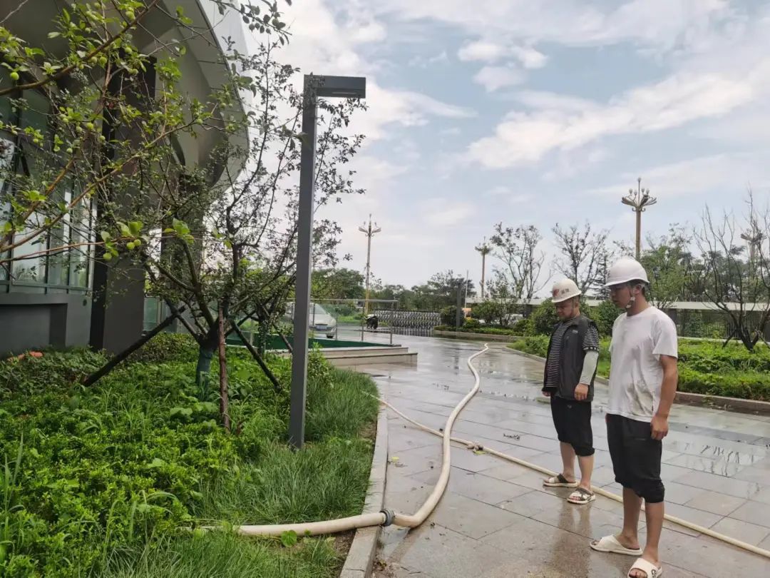7月20日,地产集团和川项目部连夜启动防汛应急预案,防汛应急队伍20余人全部在岗备勤,潜水泵、铁锹、雨衣、雨靴、防汛沙袋等排水防汛物资完成点验、检修,确保降雨时随调随用。同时对基坑,高堆土、脚手架、电气设备等关键设施、重点部位进行巡查,填补漏洞。本次降雨过程,施工现场未出现任何基坑坍塌、触电漏电及工程实体受损等事故,现场清理和积水抽排工作正紧张而有序的进行。