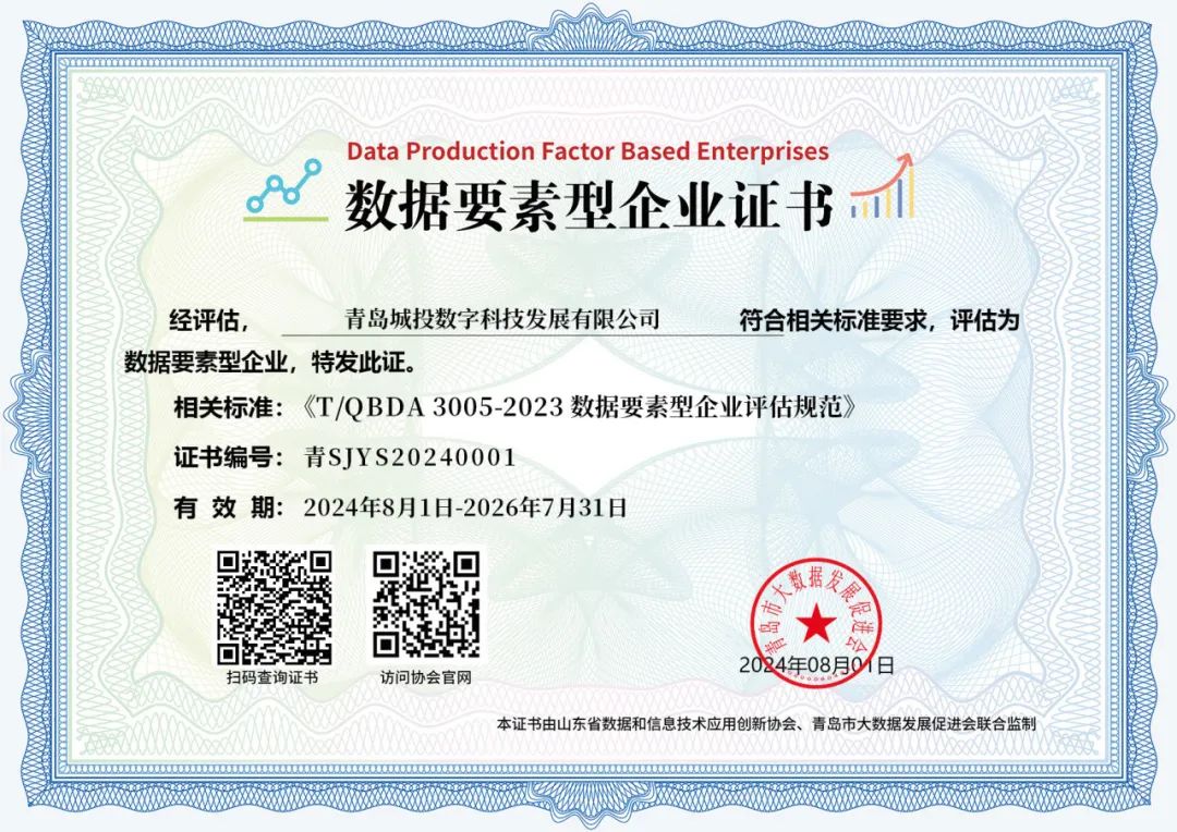 近日,青岛市大数据发展促进会(市属行业协会)公布了2024年度青岛市数据要素型企业评估结果,青岛城投集团旗下数科公司顺利获评“数据要素型企业”,成为青岛市数据要素生态建设的有力参建者。