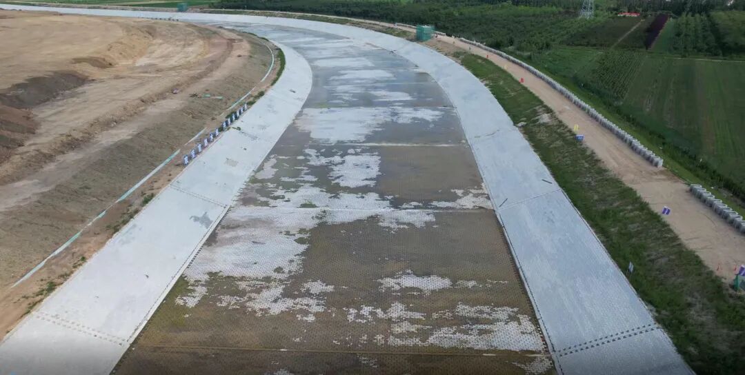 秉持绿色施工理念实现科技创新。该工程还通过在施工便道、临时堆土等水土流失易发生区域大规模喷洒固化剂,提前预防了项目区水土流失危害发生,节约了人力成本,也有效降低了大规模覆盖防尘网对周边铁路线路和机场航班起降空域所产生的安全风险隐患。整个项目注重绿色融合施工,采用混凝土预制连锁块与生态护坡相结合的大坝护坡方式,较传统浆砌石护坡具有节约高效、耐久稳固的特点,有利于减少巨量石材使用,生态护坡段可依托植被根系对土壤的加固作用,增强坡面稳定性,减少水土流失,并通过恢复或改善生态环境,形成长期稳定的边坡保护体系。