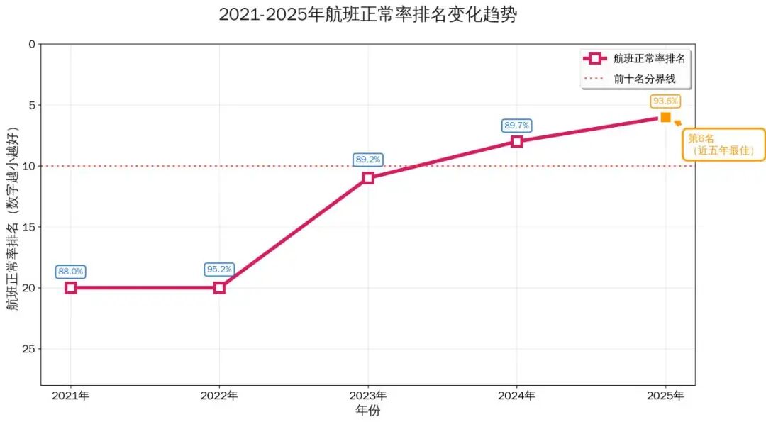 回顾2025年,青岛航空航班在保证飞行安全的前提下,航班正常性达到93.56%,创近五年(2021-2025年)来最佳成绩,高出行业平均水平2.47个百分点,在全行业42家航司中排名第6,运行品质实现跨越式提升。这不仅是运行管控能力的提升,更是青岛航空践行“情出于心,自然感动”服务理念、履行航空运输企业社会责任的坚实体现。