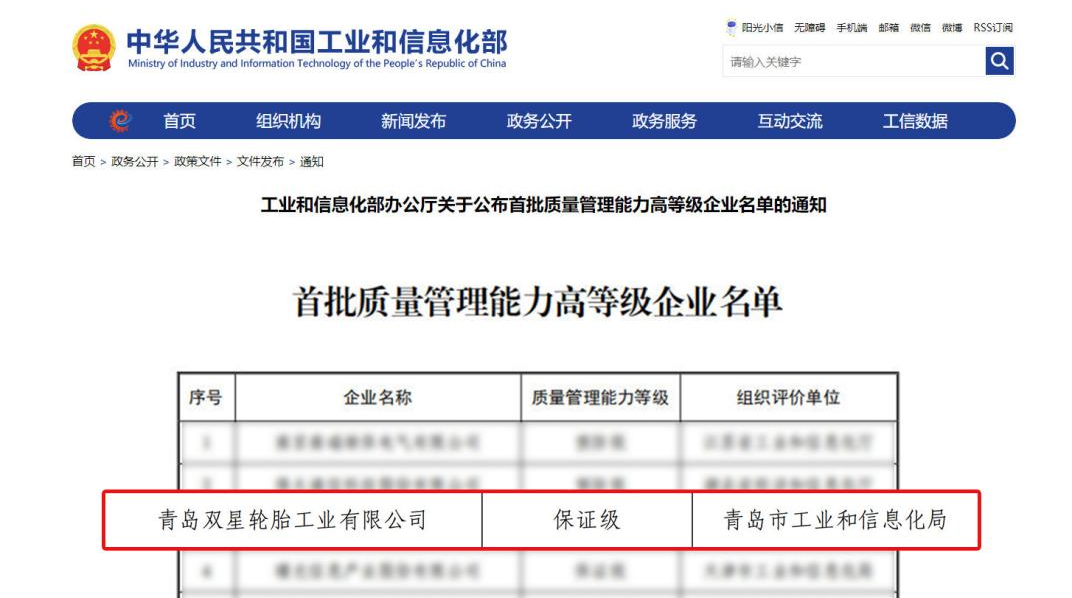 行业唯一!双星轮胎入选工信部质量管理能力高等级企业名单