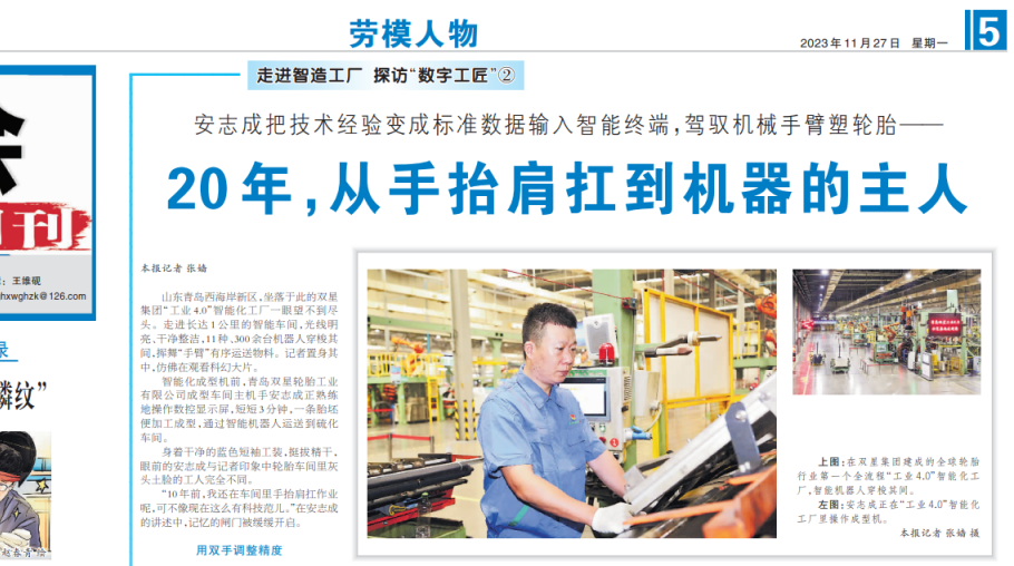 2023 11 30点击蓝字 关注“青岛城投”(图为原报道:《安志成把技术经验变成标准数据输入智能终端,驾驭机械手臂塑轮胎——20年,从手抬肩扛到机器的主人》)山东青岛西海岸新区,坐落于此的双星集团“工业4.0”智能化工厂一眼望不到尽头。走进长达1公里的智能车间,光线明亮、干净整洁,11种、300余台机器人穿梭其间,挥舞“手臂”有序运送物料。记者置身其中,仿佛在观看科幻大片。(图为安志成操作成型机)智能化成型机前,青岛双星